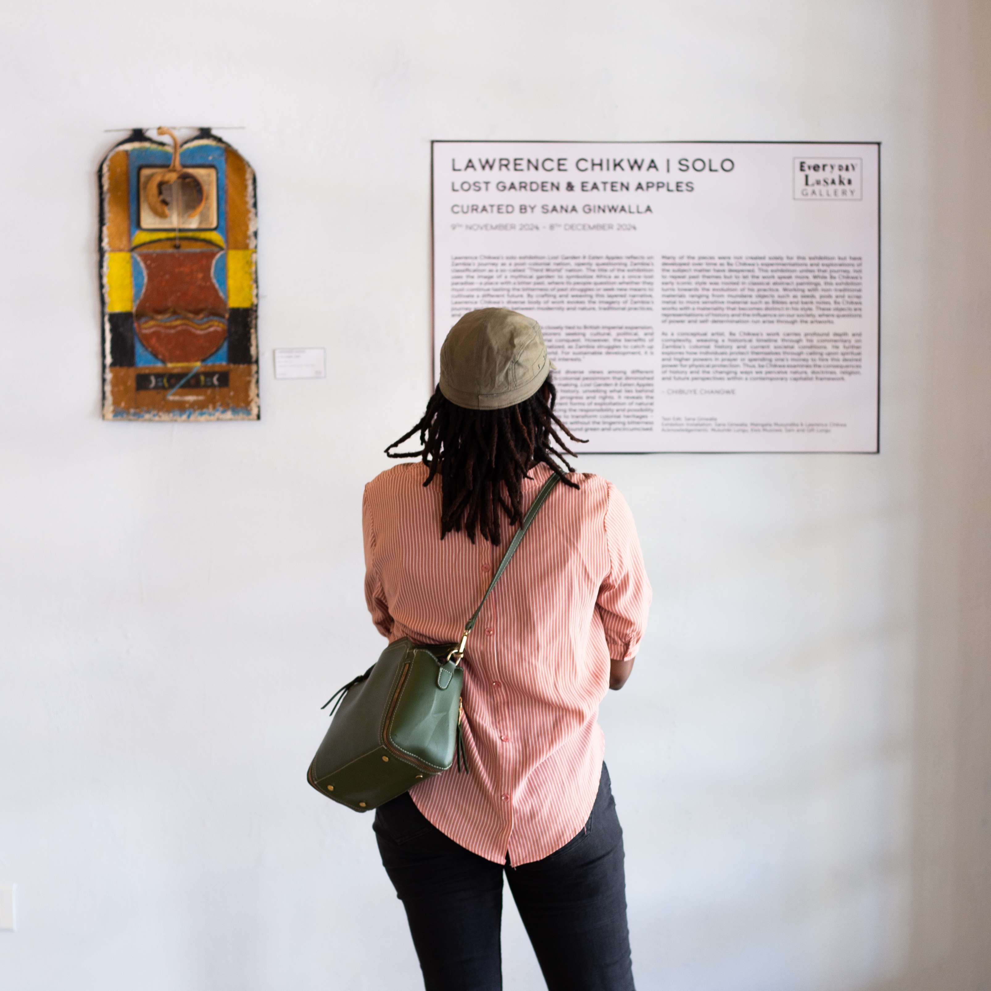 Lawrence Chikwa’s solo exhibition Lost Garden & Eaten Apples reflects on Zambia’s journey as a postcolonial nation, openly questioning Zambia’s classification as a so-called “Third World“ nation. The title of the exhibition uses the image of a mythical garden to symbolize Africa as a once-lost paradise—a place with a bitter past, where its people question whether they must continue tasting the bitterness of past struggles or seek new means to cultivate a different future. By crafting and weaving this layered narrative, Lawrence Chikwa’s diverse body of work evokes the imagery of Zambia’s journey and the shifts between modernity and nature, traditional practices, and symbols of power.